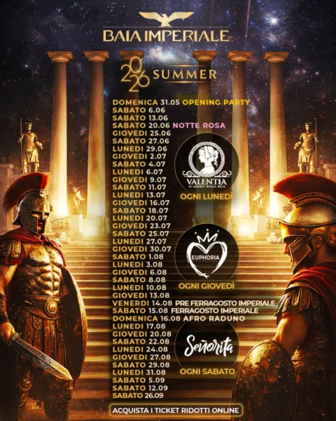Sei pronto per la notte più epica e spettacolare dell’intera estate? L’ 11 luglio 2026 Señorita infiamma la riviera con una festa monumentale! La maestosa Baia Imperiale ti aspetta per un evento assolutamente senza precedenti.