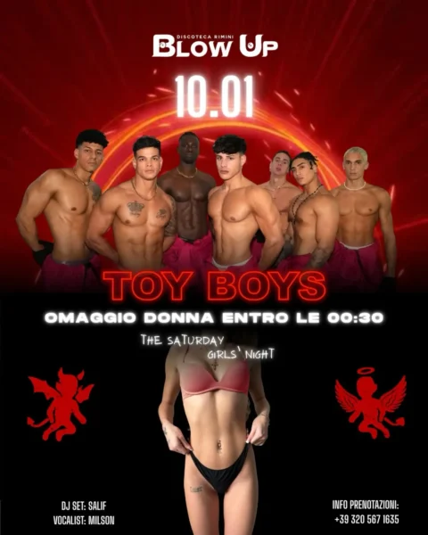 Il 10 gennaio 2026 Toy Boys arrivano al Blowup di Rimini per una serata imperdibile. Musica reggaeton, animazione latina e ingresso omaggio donna entro le 00:30.