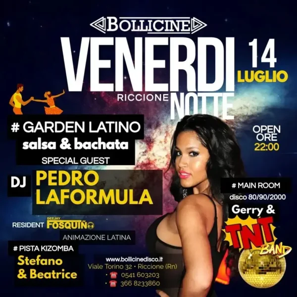 Ti segnaliamo un evento da non perdere: venerdì 14 luglio 2023, la rinomata discoteca Bollicine Riccione ospiterà una serata speciale con Pedro Formula, TNT band e Fosquino.