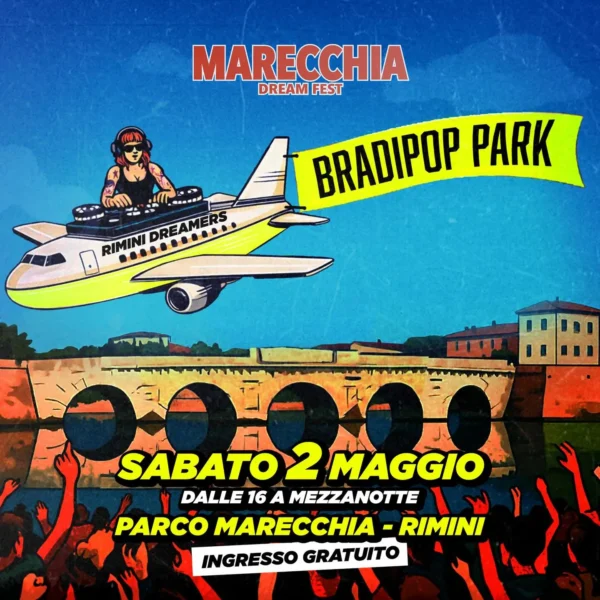 Il sole cala lentamente dietro il Ponte di Tiberio. L’energia sale. Il 2 maggio 2026 Marecchia Dreamfest trasforma la città. Un parco immenso diventa il cuore pulsante della festa. Incontra la magia del Bradipop al Marecchia Dreamfest.