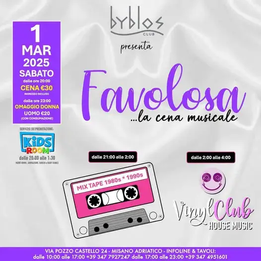 Il 1º marzo 2025, il Byblos Club di Riccione si trasforma in un palcoscenico magico con Favolosa, la Cena Musicale, un evento che unisce musica, gusto ed emozioni. Da oltre cinquant’anni, il Byblos è sinonimo di eleganza e divertimento sulla Riviera Romagnola, e questa serata sarà un viaggio negli anni ’80 e ’90, tra piatti gourmet e successi intramontabili. Unisciti a noi per vivere un’esperienza unica, dove ogni dettaglio è curato per regalarti ricordi indimenticabili. I biglietti sono già disponibili: prenota il tuo tavolo e assicurati un posto al cuore della festa!
