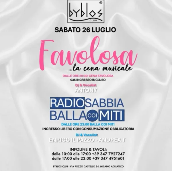 L’estate della Riviera Romagnola si accende con un evento epico. Il 26 luglio 2025, la notte prende vita con Favolosa, l’evento più atteso che trasformerà il Byblos di Riccione in un palcoscenico di pura magia.