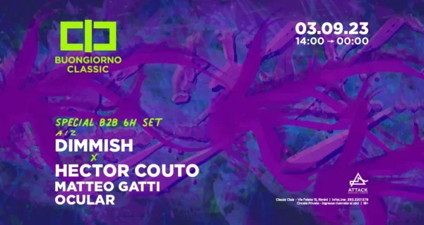 Preparati per un’esperienza indimenticabile nel mondo della musica elettronica. Domenica 3 settembre 2023 torna l’atteso evento al **Buongiorno Classic** ti porterà in una dimensione sonora unica, con le eccezionali performance di due incredibili artisti: Dimmish e Hector Couto. Preparati per un lungo pomeriggio di ritmi coinvolgenti e atmosfere suggestive, il tutto in un’ambientazione mozzafiato che ti farà ballare fino a notte fonda.