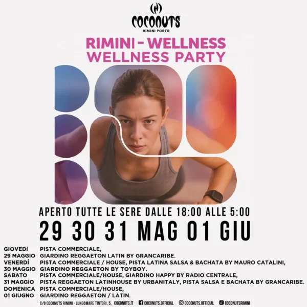 Partecipa anche tu all’evento Wellness Party coconuts! Non lasciarti sfuggire questa notte speciale a Rimini. Cerca anche “Wellness Party Rimini” per scoprire di più! Se sei in zona, non perderti l’evento “Wellness Party Riccione” (anche se si tiene al coconuts di Rimini!). Affrettati ad acquistare Wellness Party per vivere un’esperienza indimenticabile al coconuts. Non dimenticare di cercare “coconuts Wellness Party” per tutte le informazioni sull’evento del 31 maggio Wellness Party!