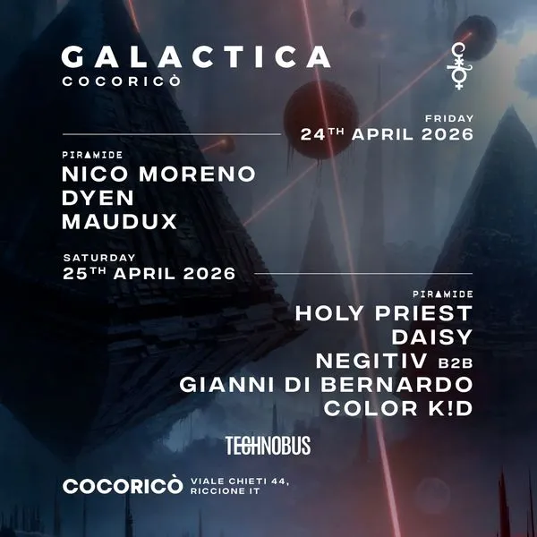 Il 25 aprile 2026 Galactica esplode nella notte. Vivi un’esperienza indimenticabile al Cocorico Riccione. La celebre Piramide di Riccione apre le porte a un festival internazionale di pura energia hard techno. Gli artisti ospiti, Holy Priest e Negitiv, trasformeranno la serata in un viaggio estremo e viscerale. Assicurati il tuo posto ora. Acquista Galactica e unisciti a questa maratona sonora spettacolare.