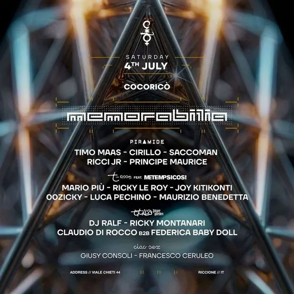 Il 4 luglio Memorabilia porta sul palco della Piramide nomi iconici come Timo MaasCirilloSaccomanRicci JrMario PiùRicky Le RoyJoy KitikontiDj RalfRicky Montanari e tanti altri. Una notte intera di musica autentica, emozione pura e cultura club che non ha eguali.