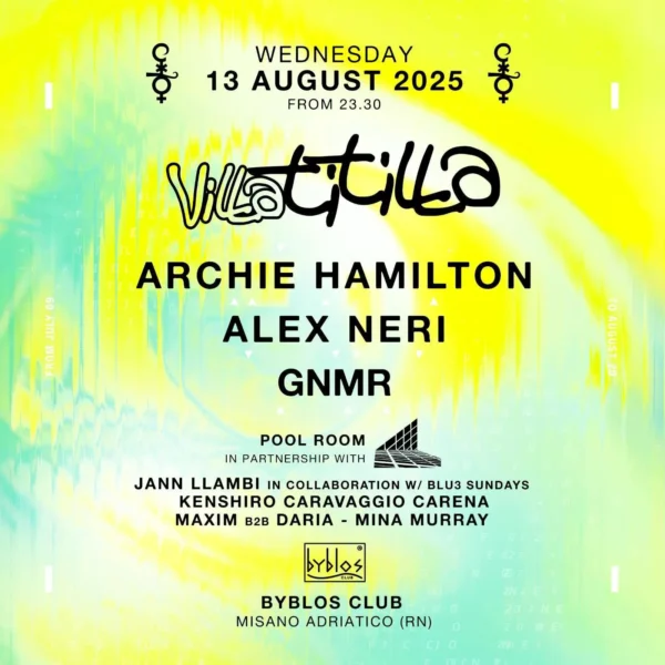 Vivi l’evento clou dell’estate: Villa Titilla al Byblos, la serata imperdibile a Riccione. Preparati a ballare con DJ di fama mondiale in una delle location più esclusive della Riviera. La consolle sarà infuocata da Archie Hamilton al Byblos, che porterà il suo inconfondibile sound house e techno. Insieme a lui, un’icona della musica elettronica italiana, Alex Neri al Byblos, per una notte di pura energia.