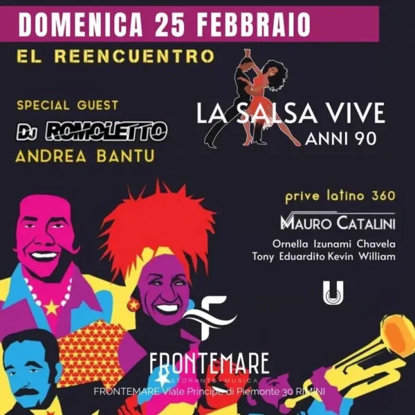 Domenica 25 Febbraio 2024, preparati a scatenare i tuoi sensi al Frontemare Rimini con La Salsa Vive Anni ’90, il party revival latino più amato della Riviera Romagnola! Un evento imperdibile per rivivere le emozioni e l’energia travolgente della musica che ha fatto ballare un’intera generazione.
