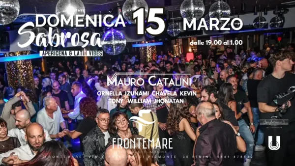 Frontemare Rimini presenta SABROSA. L'evento in programma per Domenica 15 Marzo 2026 presso Frontemare, Viale Principe di Piemonte, 30, 47924, Rimini, RN. La discoteca propone i seguenti generi musicali: Musica Latino. Puoi entrare dalle ore 22:30:00 e possono partecipare le persone almeno Over18 di età. Prima di acquistare il biglietto online controlla sempre le condizioni d'ingresso.