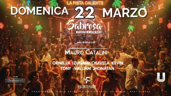 Frontemare Rimini presenta SABROSA. L'evento in programma per Domenica 22 Marzo 2026 presso Frontemare, Viale Principe di Piemonte, 30, 47924, Rimini, RN. La discoteca propone i seguenti generi musicali: Musica Latino. Puoi entrare dalle ore 22:30:00 e possono partecipare le persone almeno Over18 di età. Prima di acquistare il biglietto online controlla sempre le condizioni d'ingresso.