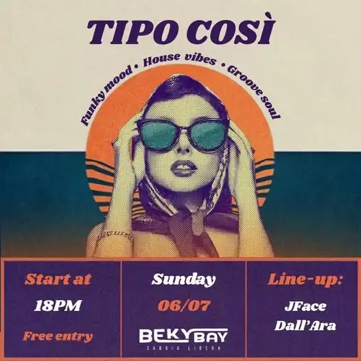 Unisciti a noi per una domenica speciale al Beky Bay con Tipo Così. Immagina di ballare sulla sabbia, con il sole che cala all’orizzonte e la migliore musica house come colonna sonora. Questo è quello che Tipo Così porta al Beky Bay: un’atmosfera unica che unisce festa, mare e buona musica.
