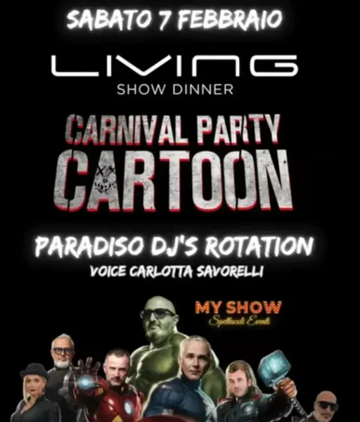 Sei pronto a vivere una notte leggendaria? Il 07 febbraio 2026 Carnival Party trasformerà il Living Disco in un universo magico. Immagina un mondo fatto di colori, maschere e i tuoi personaggi preferiti dei cartoni animati. Questa è la notte che hai sempre sognato.