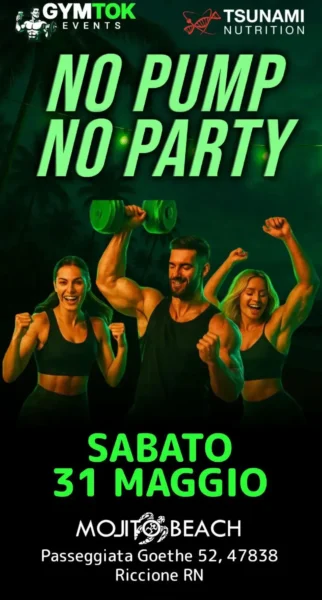 No Pump No Party non è solo un nome. È la celebrazione perfetta dopo la Fiera del Wellness. Unisce la passione per il fitness con il divertimento di una festa in spiaggia. Immagina musica coinvolgente, gente dinamica e l’atmosfera unica del Mojito Beach.