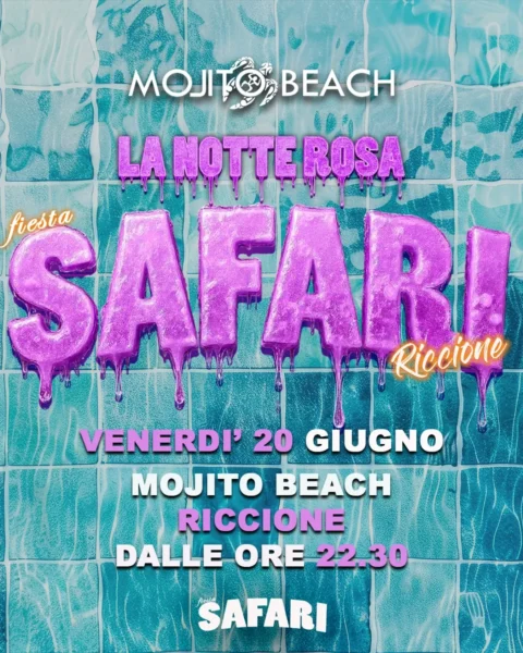 Save the date! Il 20 giugno 2025, una notte magica ti aspetta. Il Mojito Beach di Riccione si trasforma per l’evento più atteso della Notte Rosa: il Safari Notte Rosa. Un’esperienza epica che non puoi assolutamente perdere! Vivi la magia del 20 giugno 2025 Safari Notte Rosa e lasciati trasportare in un mondo incantato. Il Safari Notte Rosa al Mojito Beach sarà il momento clou del tuo inizio estate. Assicurati subito il tuo posto: acquista i biglietti e prenota il tuo tavolo per una notte da favola!