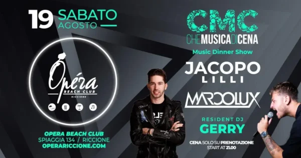 Il sabato 19 agosto 2023, l’Opera Beach Club Riccione si trasformerà nella cornice perfetta per un evento straordinario: “Opéra: CMC-Che Musica di Cena”. Preparati a vivere una serata indimenticabile all’insegna della musica, del divertimento e dell’eleganza con Jacopo Lilli.