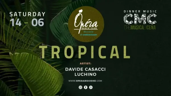 Vivi una serata straordinaria all’Opèra Beach Club con l’evento Tropical il 14 giugno 2025. Questa notte speciale porta un’atmosfera esotica e festosa direttamente sulla riviera romagnola. L’evento Tropical all’Opèra è più di una semplice festa: è “Che Musica di Cena”, uno spettacolare dinner show che promette scintille. Immagina una cena deliziosa seguita da musica travolgente e performance artistiche che ti lasceranno senza fiato. Il tema Tropical arricchisce l’Opèra Beach Club con un’energia contagiosa, perfetta per una notte di puro divertimento. Sarai trasportato in un mondo di ritmi caldi e colori vivaci, con DJ set che spaziano dalla house alla musica latina, ideali per ballare fino all’alba.