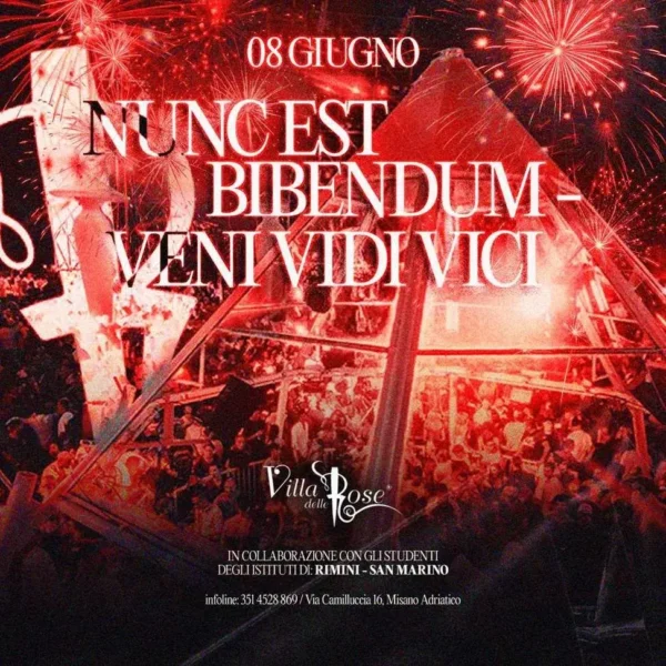 È arrivato il momento che stavi aspettando! Hai studiato, ti sei impegnato, e ora è tempo di celebrare in modo indimenticabile. Segna questa data: 08 giugno 2025. Il luogo è l’icona del divertimento in Riviera: la Villa delle Rose Riccione. E l’evento che celebra la fine dell’anno scolastico in grande stile è Nunc Est Bibendum. Un binomio potentissimo: 08 giugno 2025 Nunc Est Bibendum alla Nunc Est Bibendum Villa delle Rose. Questa non è una semplice festa, è IL party di fine anno che non puoi assolutamente perdere. Preparati a vivere una notte epica. Il tuo posto in questa celebrazione ti aspetta.