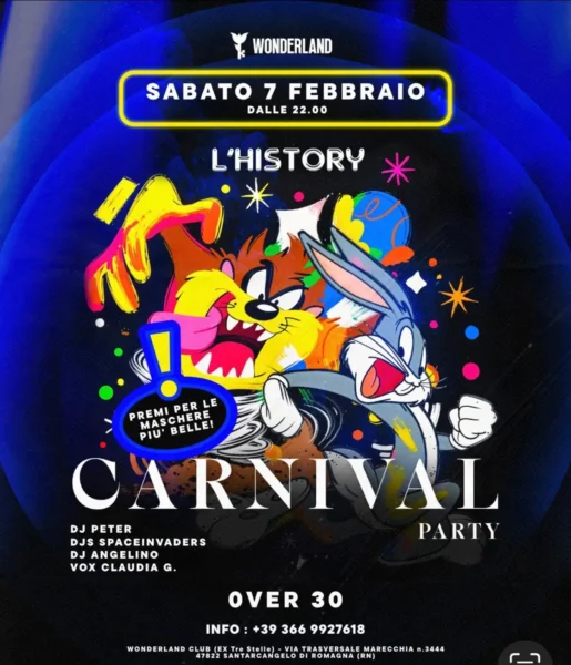 Il 07 febbraio 2026 non perdere il Carnival Party al Wonderland Club di Santarcangelo (Rimini). Una notte epica con musica commerciale, premi per le maschere migliori e un’atmosfera magica.